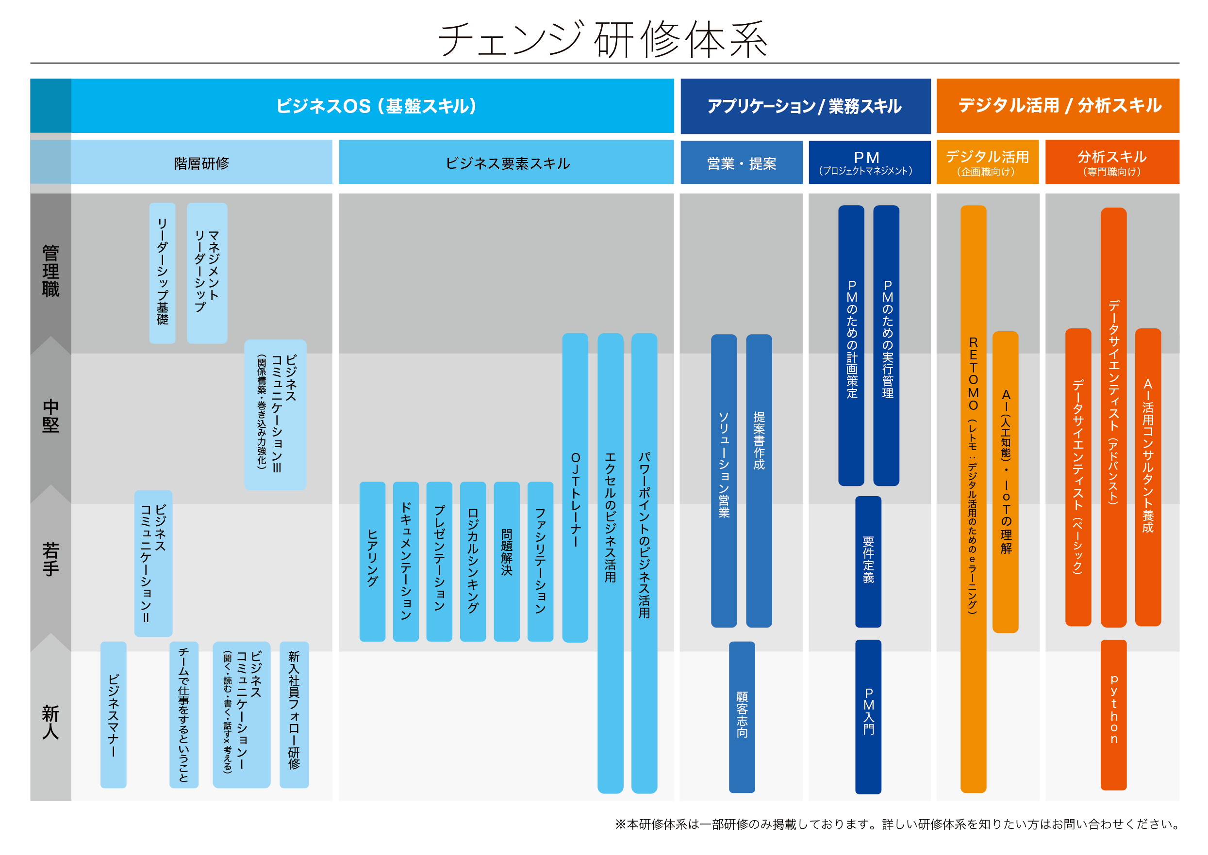 当社では、新入社員に対して、毎年2か月に渡る新入社員研修を実施しております。新入社員研修では、社会人として保持すべき「ポータブルスキル(ビジネスマナー、ビジネスコミュニケーション、Wordを活用したドキュメンテーション、Excelのビジネス活用、PPTを活用したプレゼンテーション、ロジカルシンキング、ビジネスヒアリング、会計に関する基礎知識など)」を学ぶとともに、現場で実践することを想定した「ビジネススキル(当社のビジネスモデル、チームで働くということ、顧客志向の考え方、プロジェクトワークの進め方、デジタル・AIを活用した業務プロセス改善の基礎、分析スキルなど)」を、当社の役員又は第一線で活躍する社員等が講師となりOff-JT形式で集中的に実施しております。また、新入社員研修受講後には、年間を通して社内トレーニング(職種/階層/在籍期間別)を実施しております。